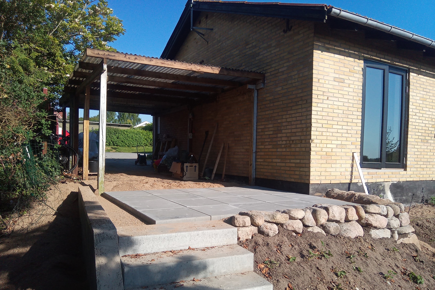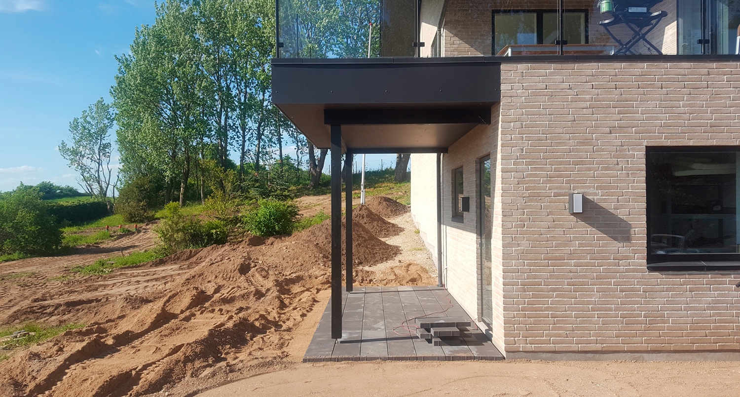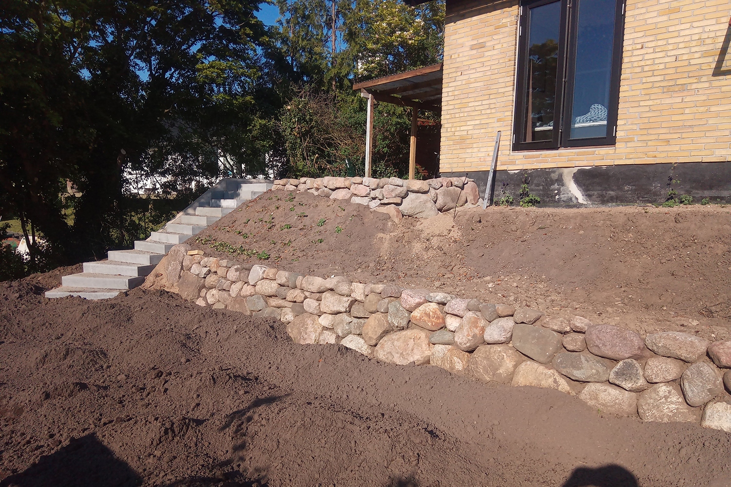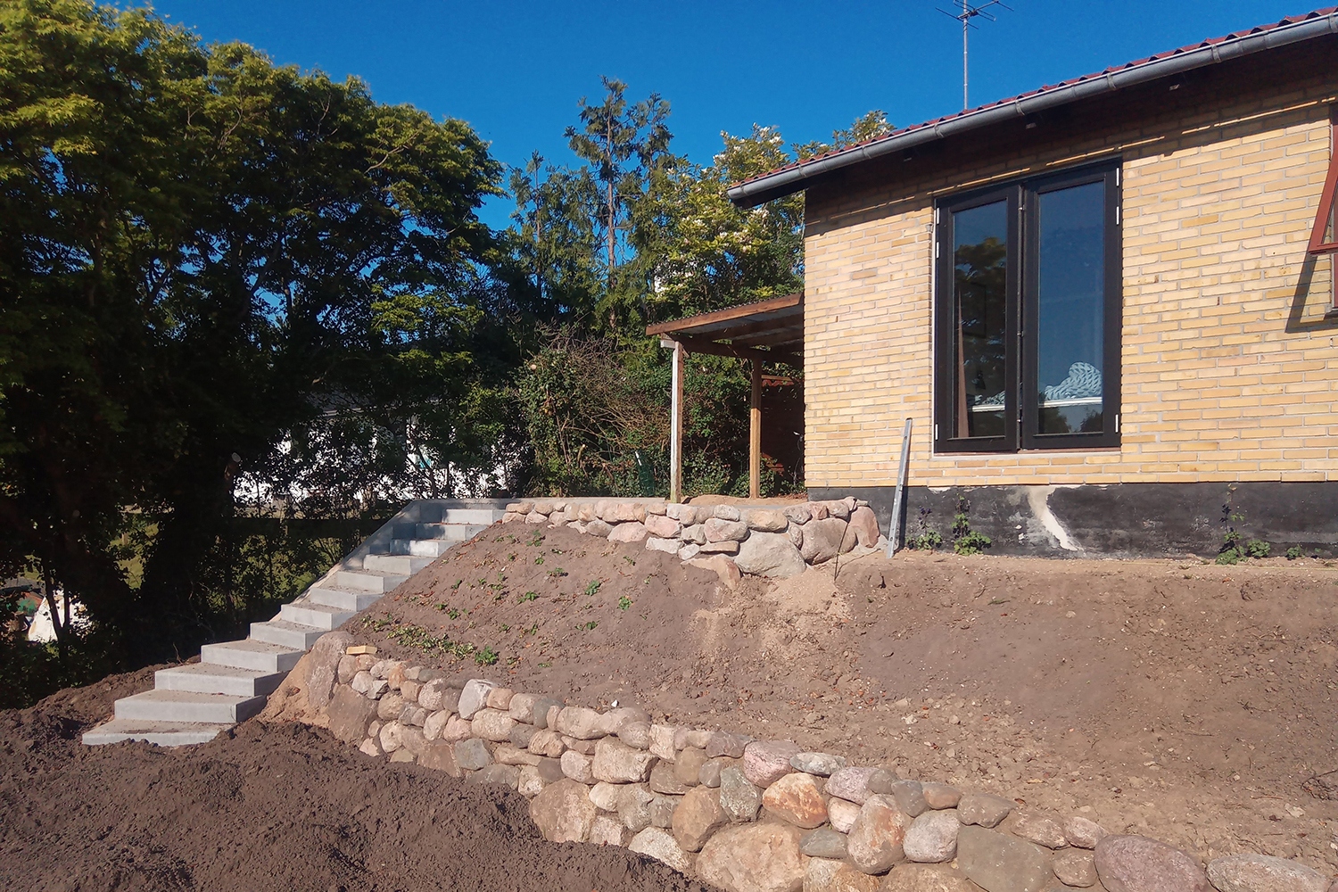 Opgave i Vistoft på Mols med nedrivning af carport, sænkning af niveau i indkørsel samt etablering af nyt stendige og trappe. Anlæg af terrasse, etablering af indkørsel, træfældning, flisning af træ og anlæg af ny græsplæne