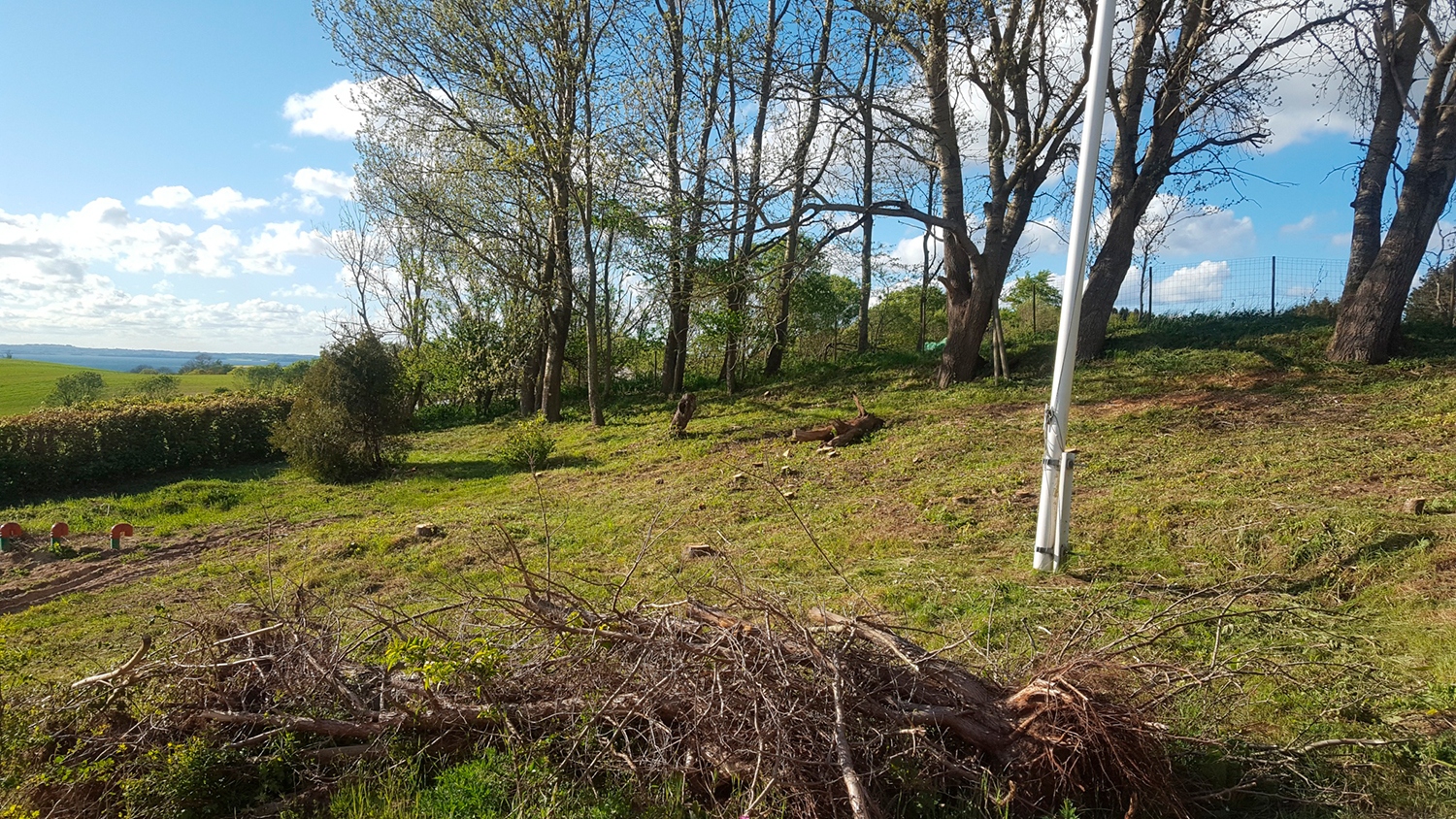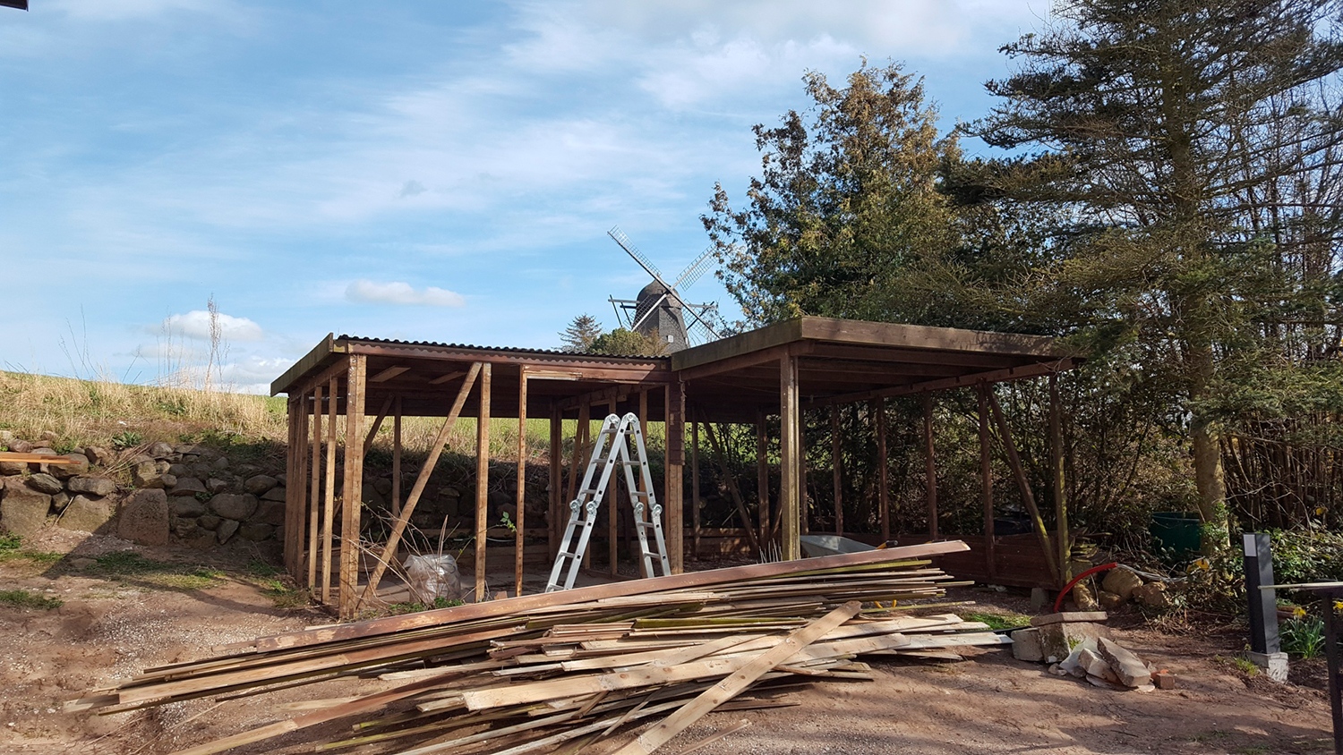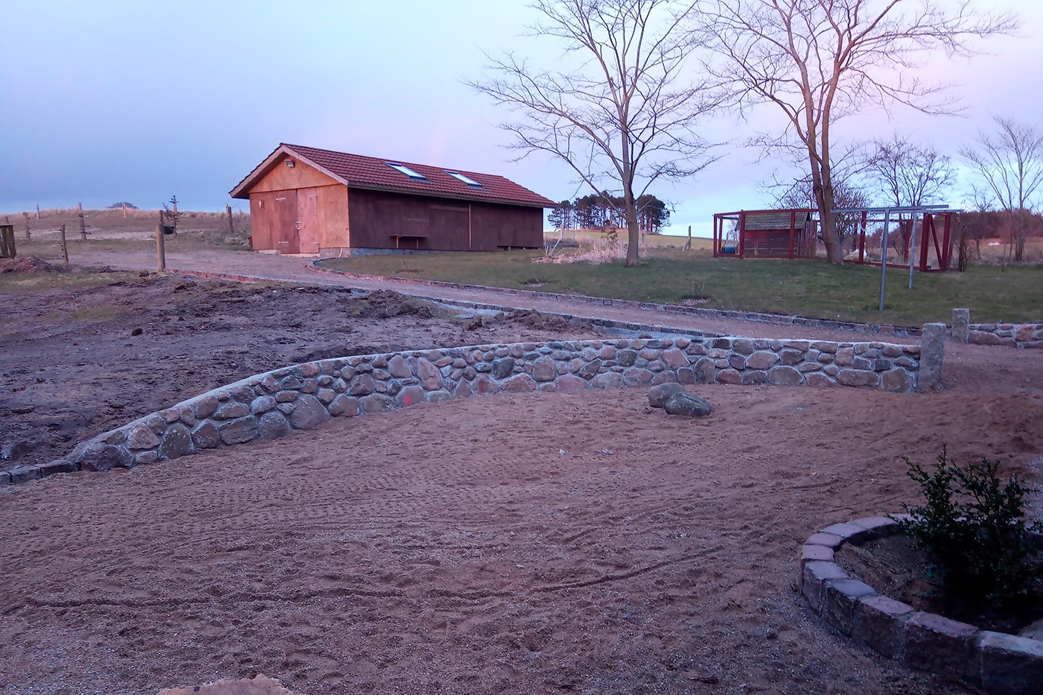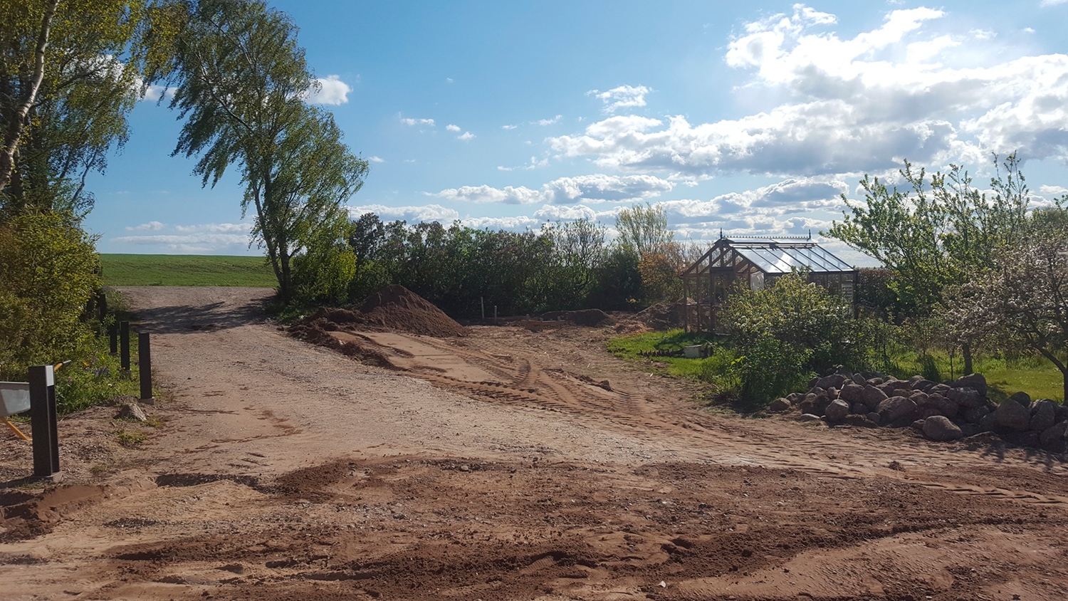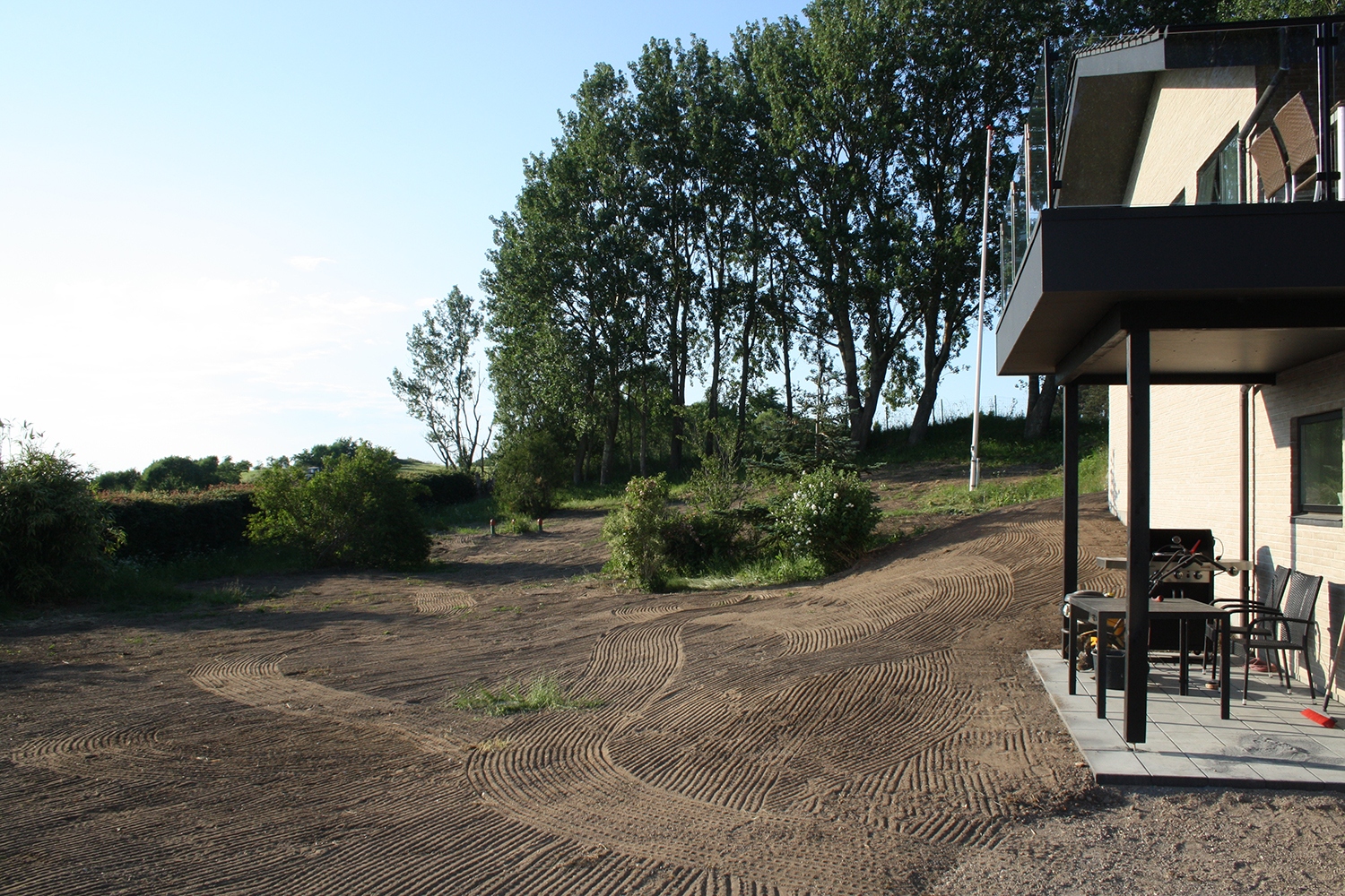 Opgave i Vistoft på Mols med nedrivning af carport, sænkning af niveau i indkørsel samt etablering af nyt stendige og trappe. Anlæg af terrasse, etablering af indkørsel, træfældning, flisning af træ og anlæg af ny græsplæne